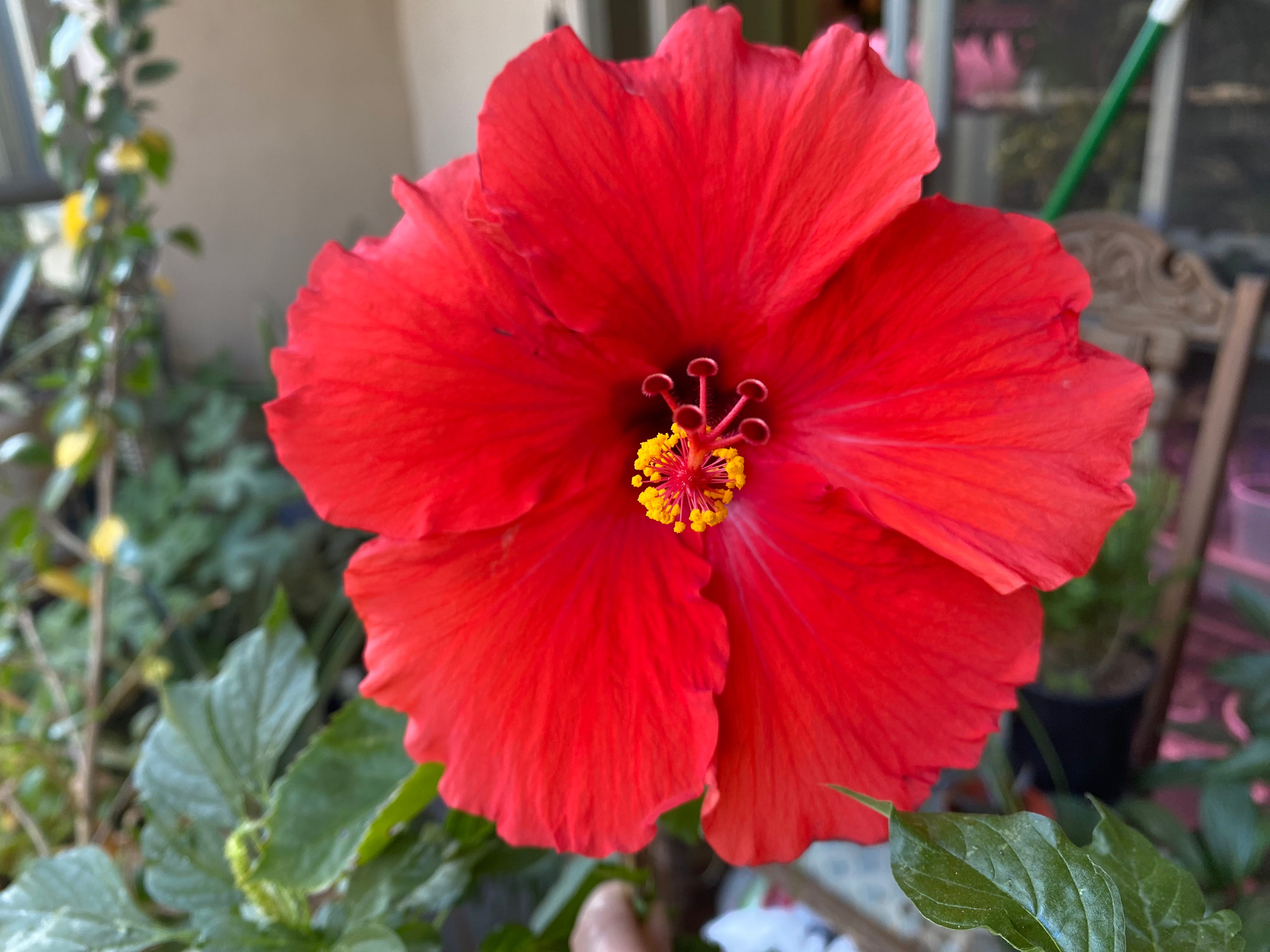 In this hibiscus from my balcony garden you can see the yellow, pollen bearing stamens and the red stigma of the pistil.