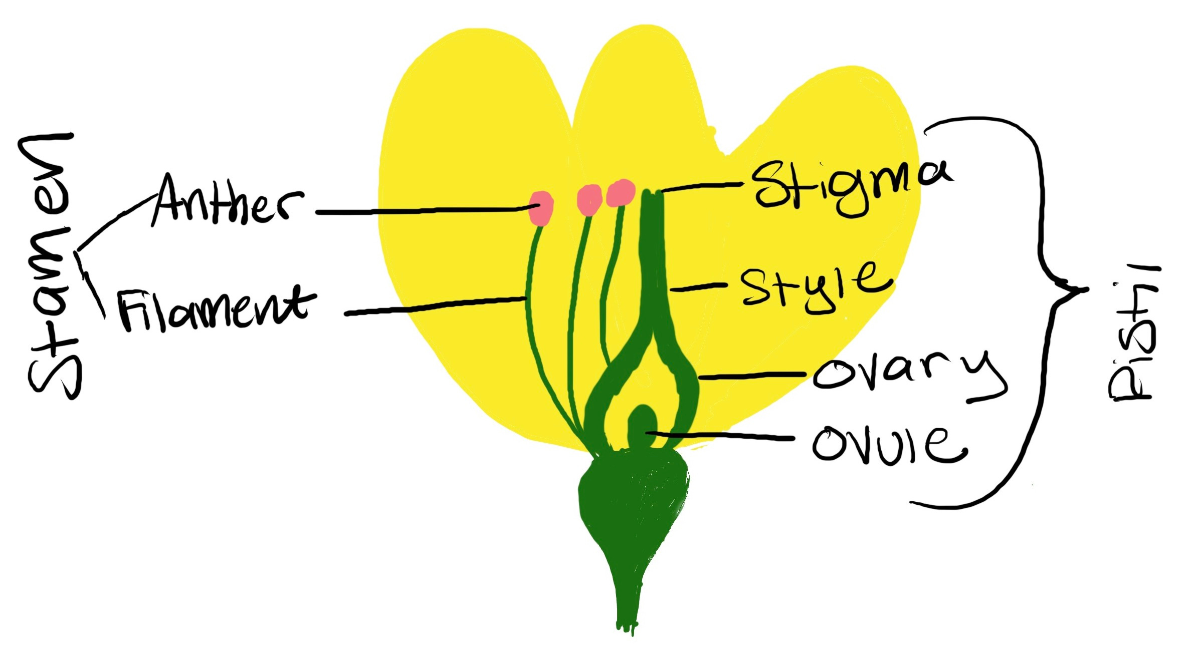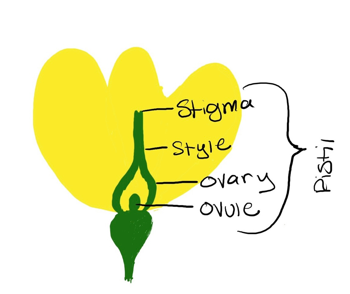 So here we go. Below is a flower with only female parts. The stigma is sticky and generally kind of cup shaped so that pollen will stick to it and then fall down the hollow style into the ovary.