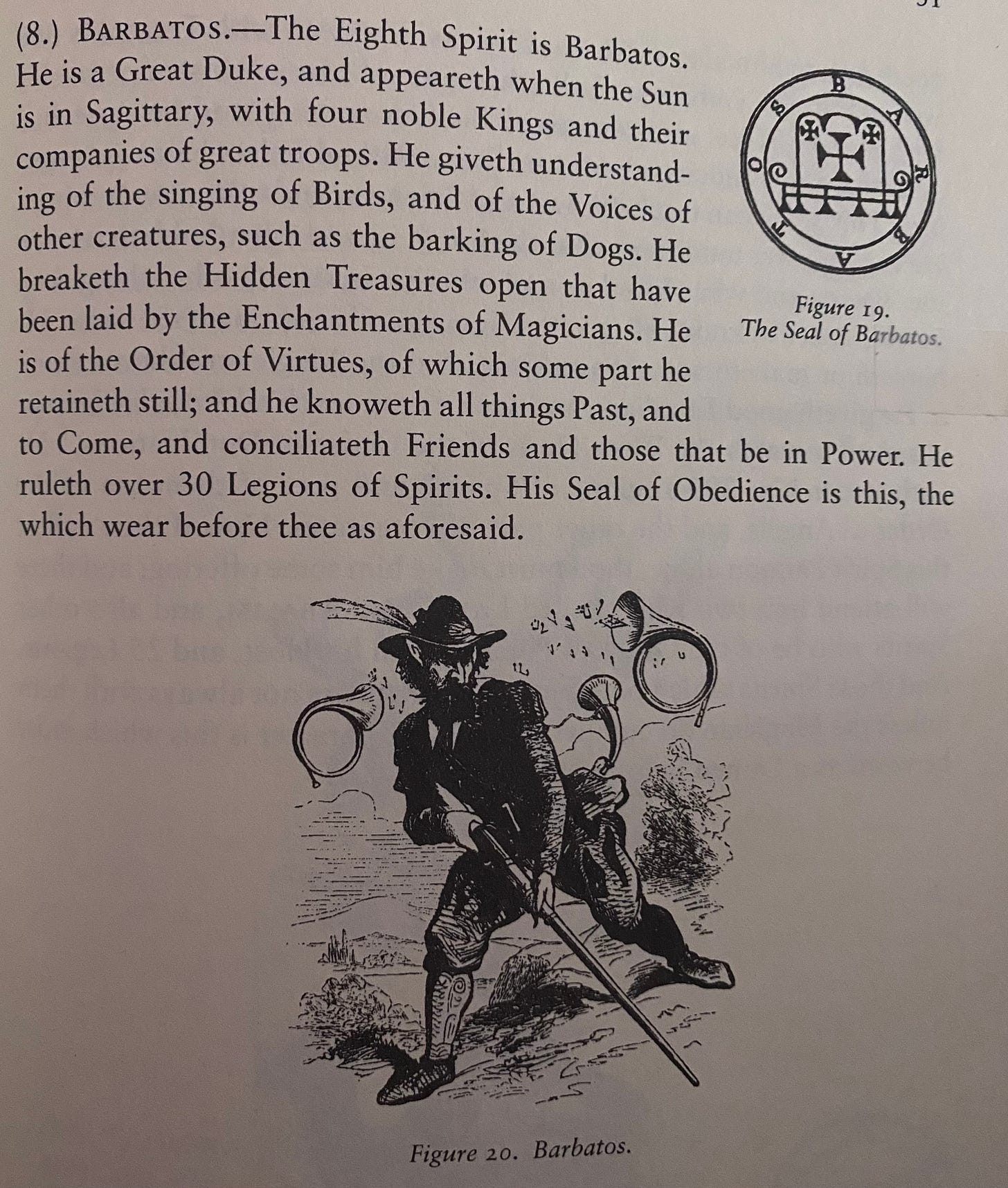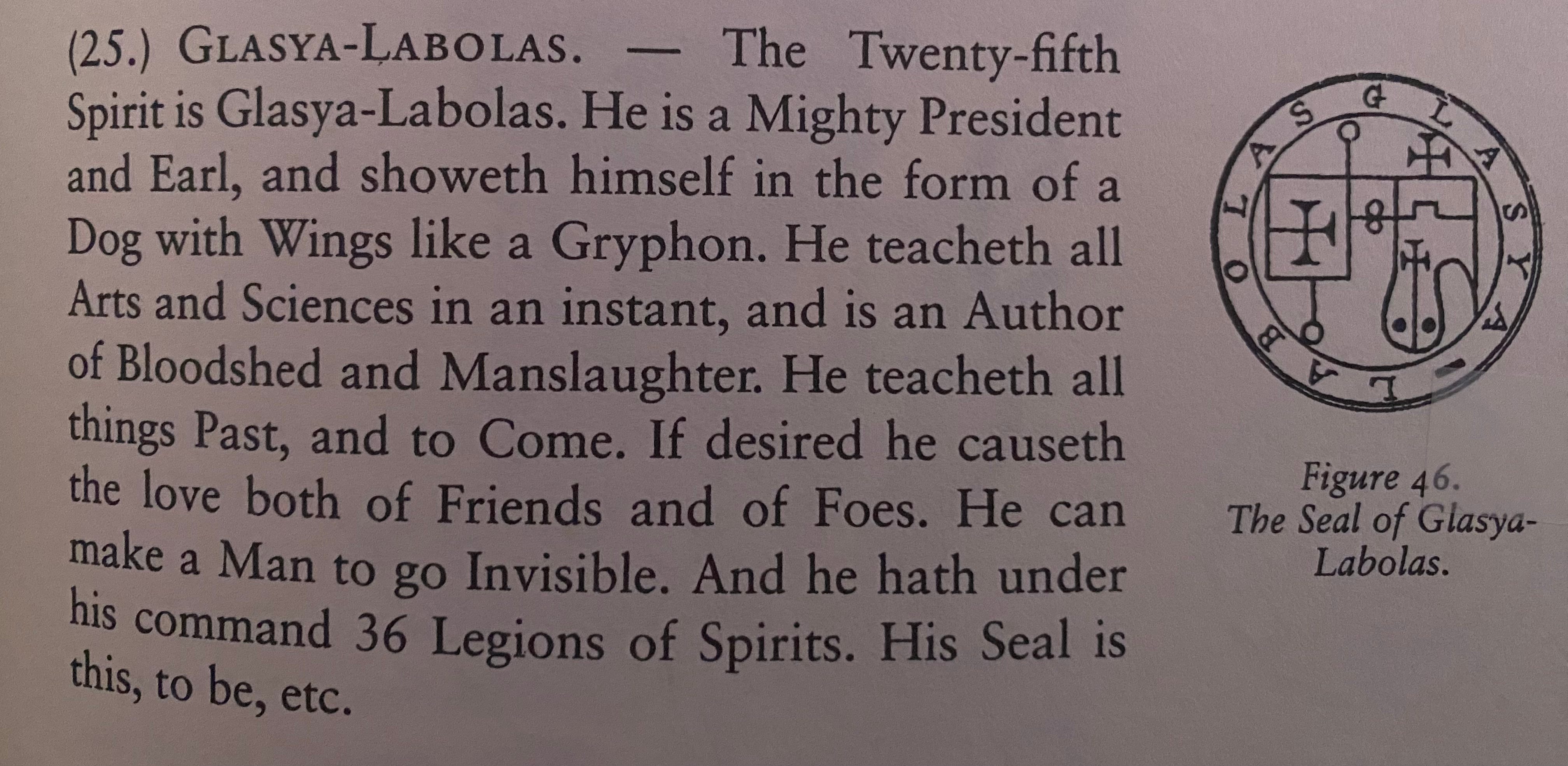 The Goetia or Ars Goetia is one part of five of a 17th century grimoire called The Lesser Key of Solomon the King, or Clavicula Salomonis Regis and the title refers to the art of summoning demons. Among other things the book has a list of seventy-two upper ranked denizens of Hell, some with pictures. The art mostly comes from another demonic compendium called the Pseudomonarchia Daemonum by Johann Weyer. The version I have also has some really… interesting art by Aleister Crowley, but he’s a topic for another day.