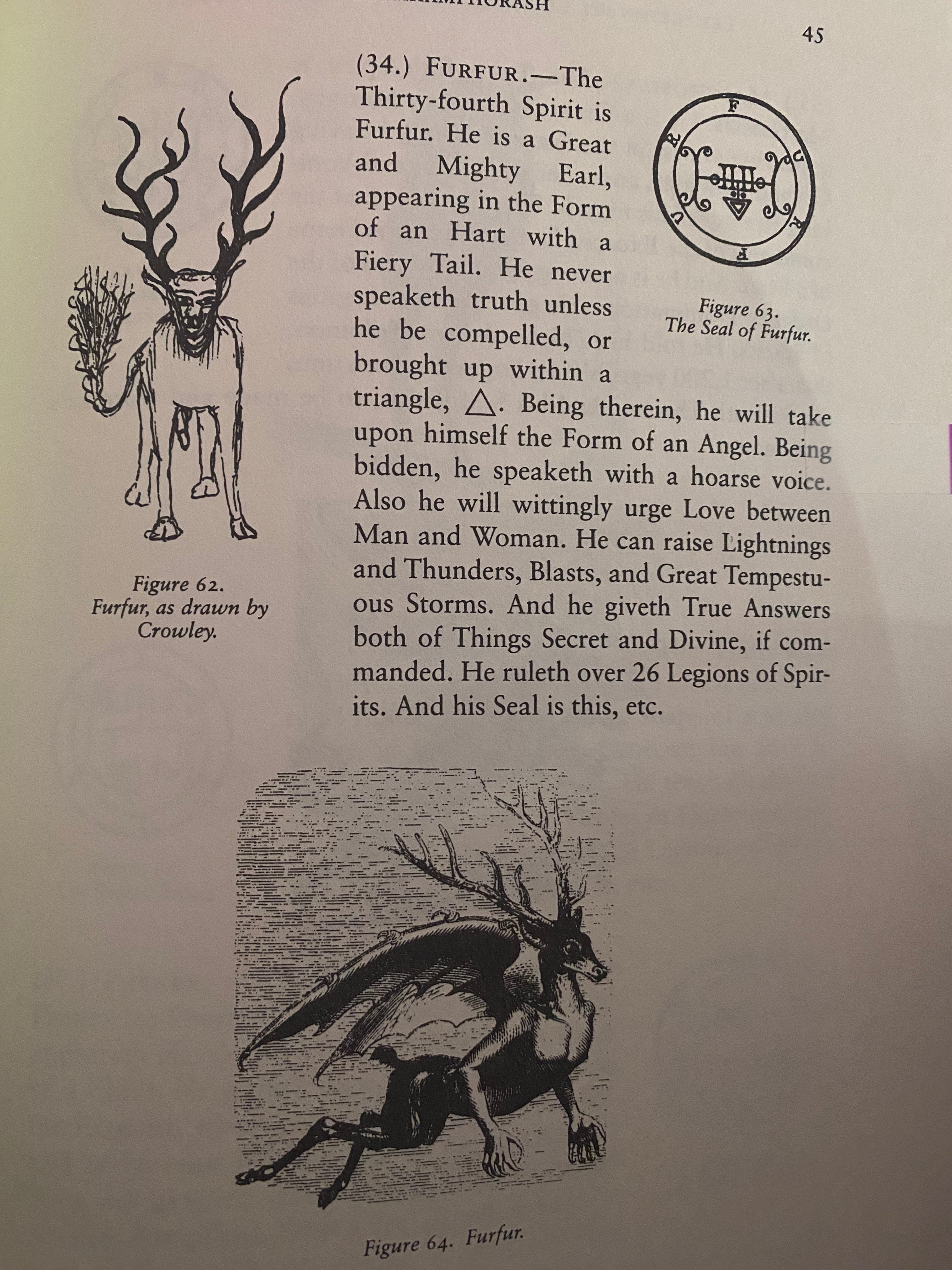Makes storms and stuff, very useful. Can look like a deer with a fiery tail OR and angel if you make him stand inside a triangle. Demon rules are so great. Crowley’s art? Not so much.