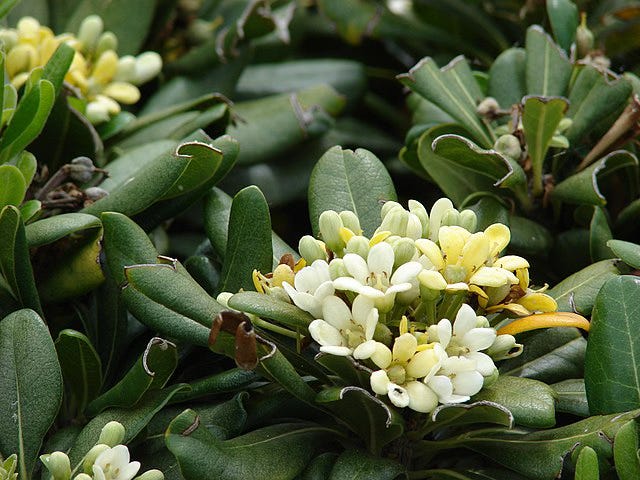 Now, cheese-scented wood aside, another of P. tobira’s common names is the mock orange because its creamy white blossoms smell similar to orange blossoms. This I can confirm, they smell incredible in the spring.