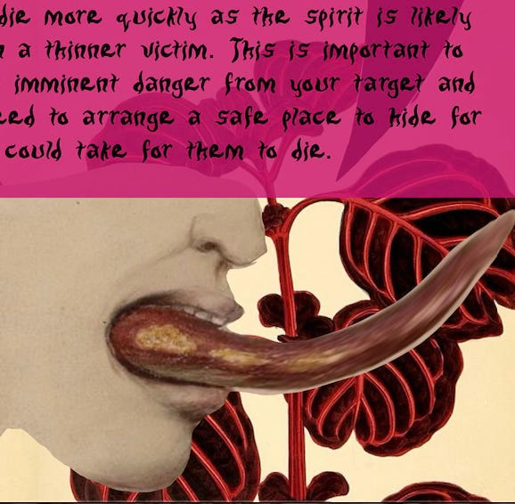 Mmm... I get dizzy just thinking about its smoke. Fills the lungs and fills the head with happy thoughts of others dead. There’s nothing quite like it. Smokey visions of a black figure, hungry for life force. It’ll latch on to anything with a pulse if you aren’t careful. That, of course, means you. So keep your focus on your victim, you’ll do a little astral shimmy to get where they are, then the fun begins. This spirit will bind to them and feed until they wither and die. The rapidity of death depends on the size of the victim, larger victims will die more quickly as the spirit is likely to glut themselves. They’ll ration a thinner victim. This is important to plan for. If, for example, you’re in imminent danger from your target and your target is a thin one, you’ll need to arrange a safe place to hide for the days or weeks it could take for them to die.