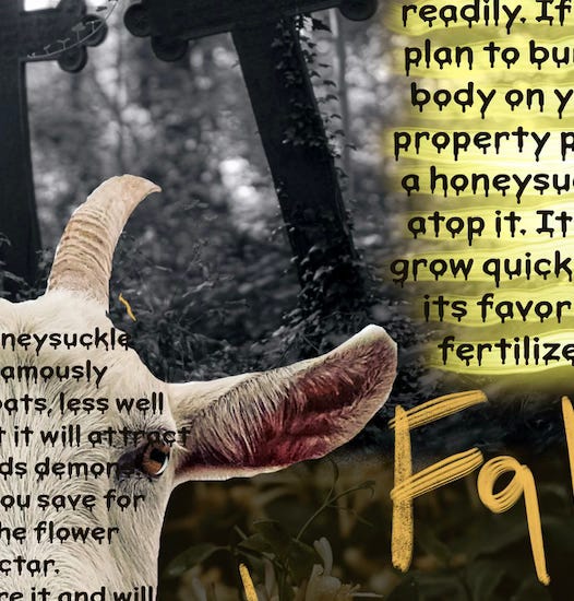 While honeysuckle does famously attract goats, less well known is that it will attract crossroads demons. Be sure you save for them the flower nectar. They adore it and will give you a better deal on your soul trade in.